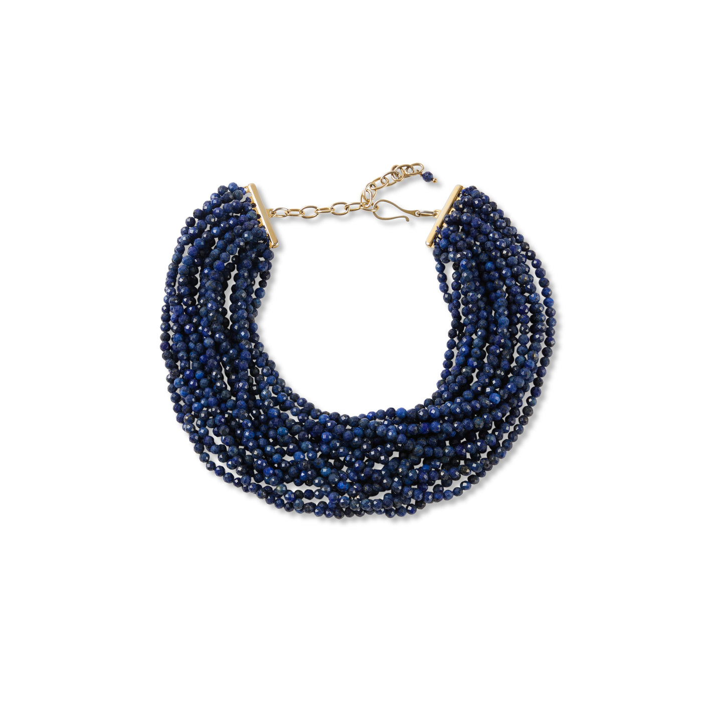 Collana in lapislazzuli a 18 fili con chiusura a gancio in ottone dorato.