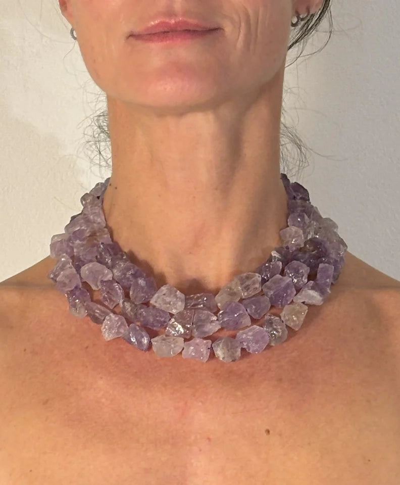 L'ametista è una varietà di quarzo che si distingue per il suo caratteristico colore viola, che può variare da tonalità chiare a scure, e che è spesso utilizzata nella creazione di gioielli, tra cui collane. È apprezzata non solo per la sua bellezza ma anche per le sue proprietà simboliche e spirituali. L'ametista presenta una gamma di tonalità che va dal lavanda delicato al viola intenso. Le sfumature sono determinati dalla presenza di ferro e da altri elementi nel suo cristallo. Il colore uniforme e luminoso rende ogni pezzo unico. Tradizionalmente, l'ametista è associata alla saggezza, alla serenità e alla spiritualità. Si dice che favorisca la meditazione e l'intuizione, oltre a proteggere da energia negativa.