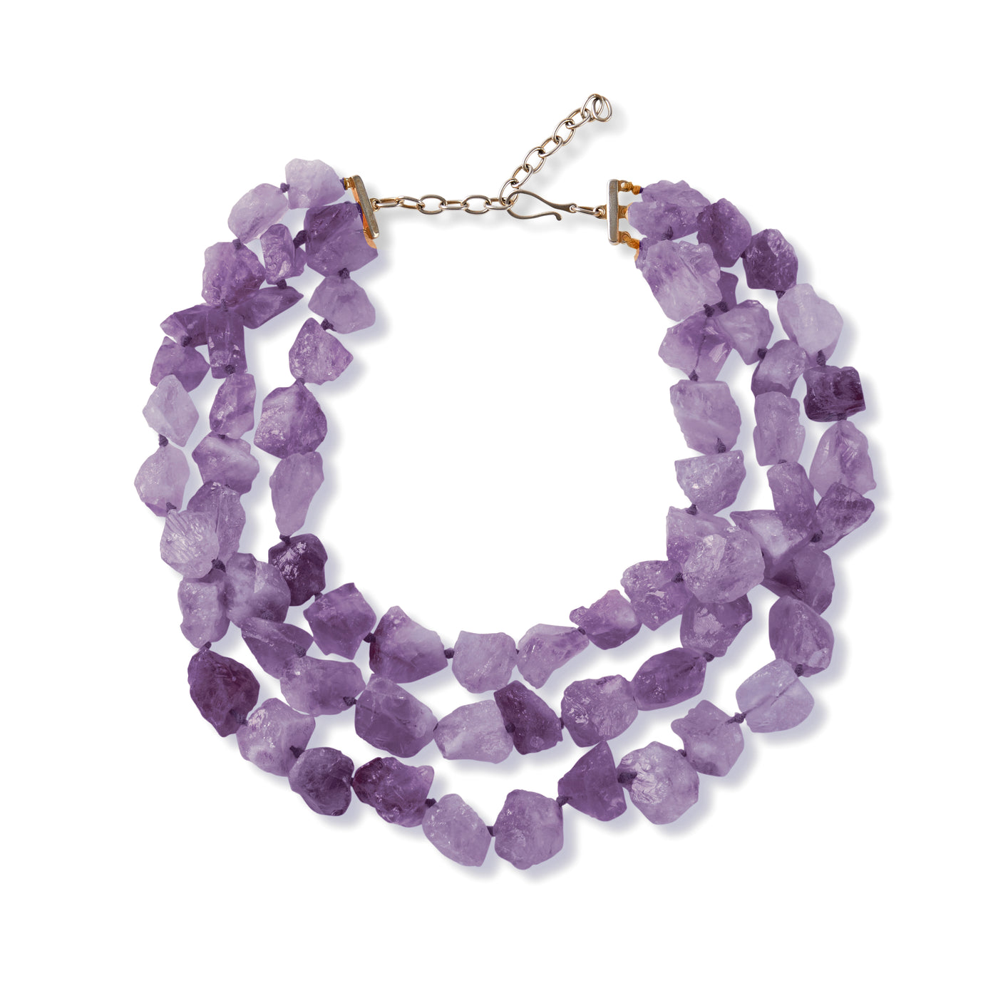 Collana in ametista a 3 fili con chiusura a gancio in ottone dorato. Pietra a taglio irregolare. Luogo di estrazione: Brasile Lunghezza girocollo: 38 cm. La lunghezza della collana puo' variare in base alla dimensione delle pietre.