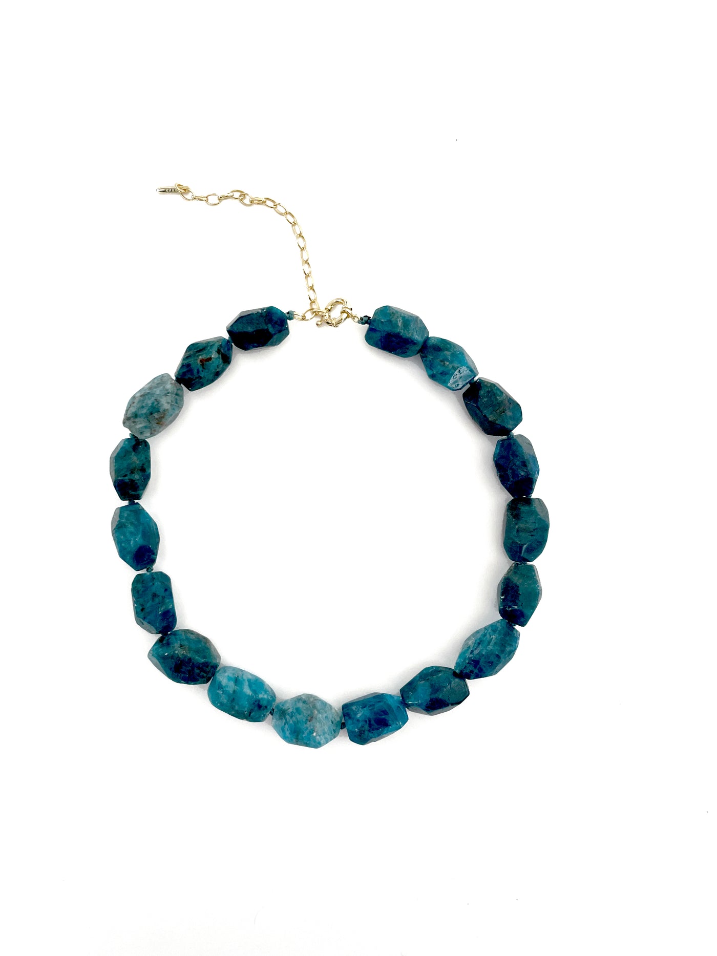 Collana in apatite turchese con chiusura singola in argento placcato oro 14 Kt. Pietra a taglio irregolare. Luogo di estrazione: Messico Lunghezza collana regolabile: da 46 a 38 cm.