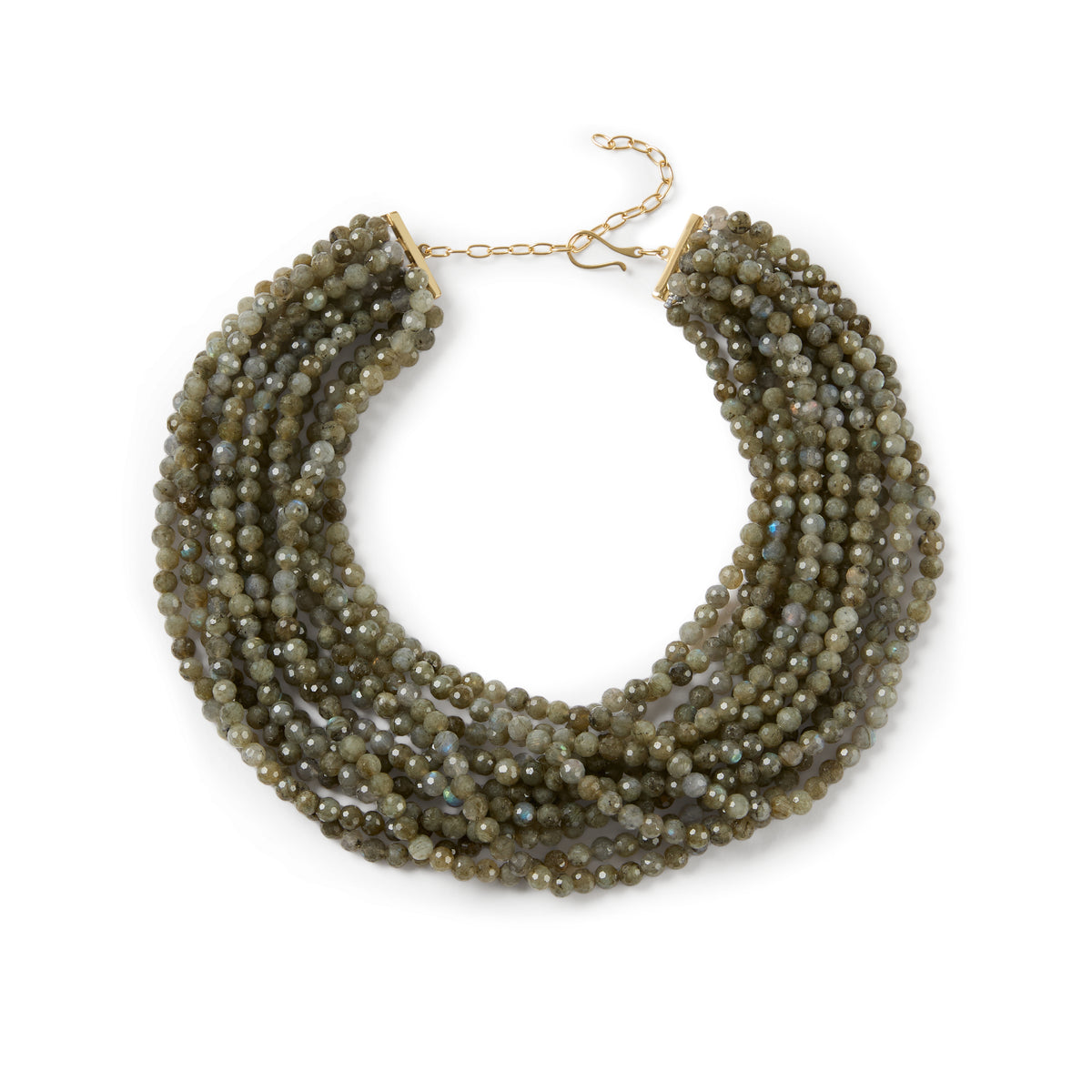 Collana in labradoritea 12 fili con chiusura a gancio in ottone dorato. Pietra 6mm hard cut. Luogo di estrazione: Canada Lunghezza collana: 35 cm, piu' catena da 9 cm. La lunghezza della collana puo' variare in base alla dimensione delle pietre.