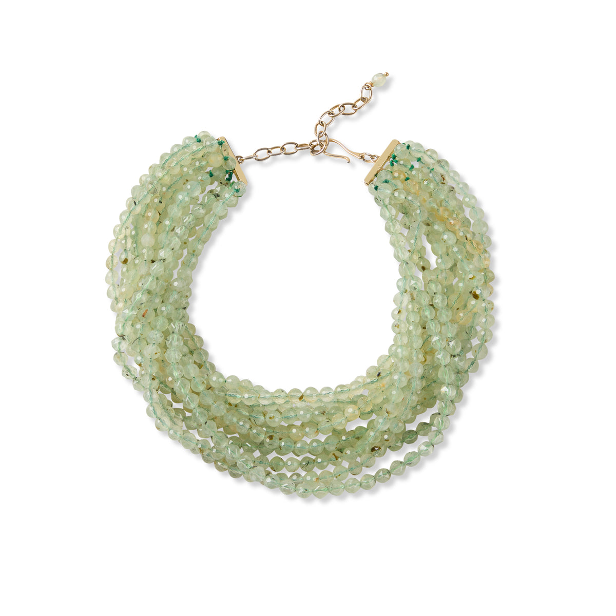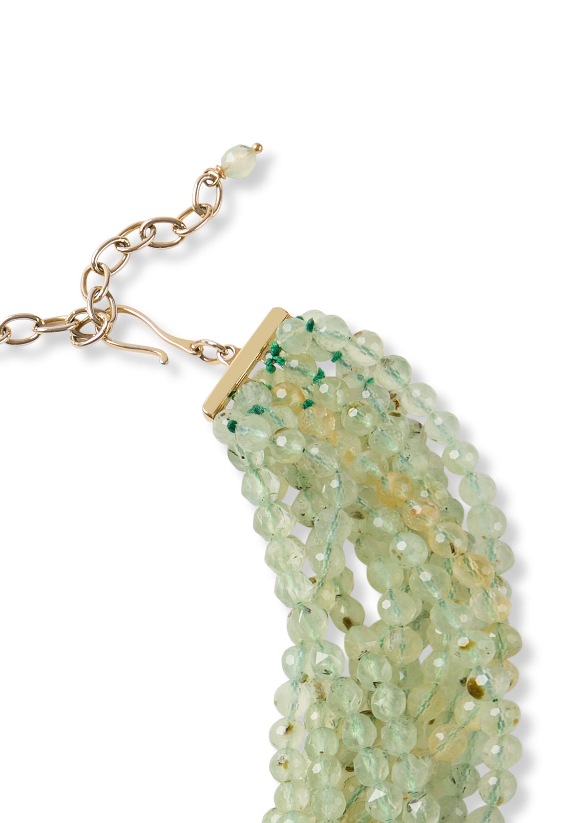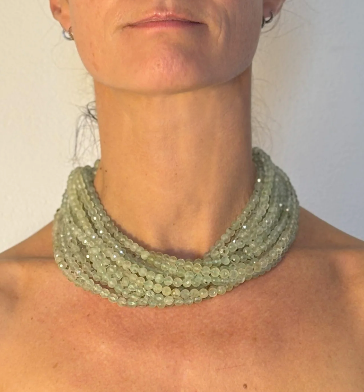 Collana in prehnite a 1 2fili con chiusura a gancio in ottone dorato. Pietra 6mm hard cut. Luogo di estrazione: Sudafrica Lunghezza collana: 35 cm, piu' catena da 9 cm. La lunghezza della collana puo' variare in base alla dimensione delle pietre.
