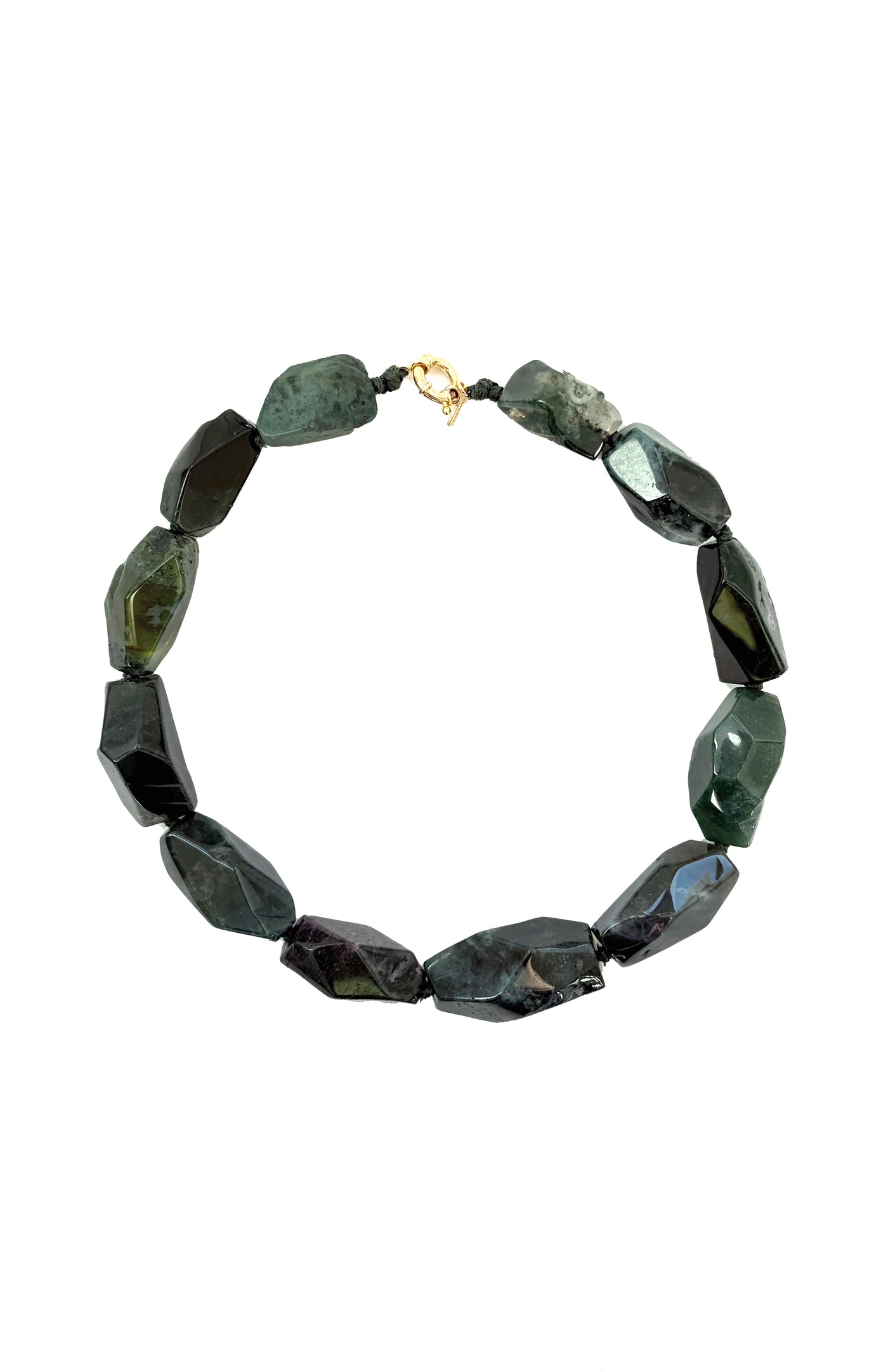 Collana in agata indiana con chiusura singola in argento placcato oro 14 Kt. Pietra a taglio irregolare. Luogo di estrazione: India Lunghezza collana regolabile: da 46 a 38 cm.